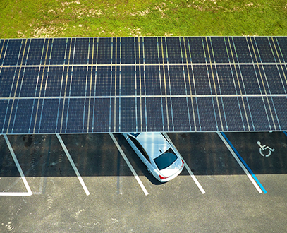 Stylish, space-saving canopies generate solar energy while providing covered parking or outdoor areas.